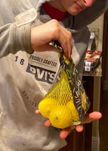 Zach whirled around, stuck his head in the bag, and pulled out the lemons. He examined them and turned them around in his hands like Indiana Jones with the crystal skull. He then promptly shoved the lemons, along with the oranges, in the refrigerator.